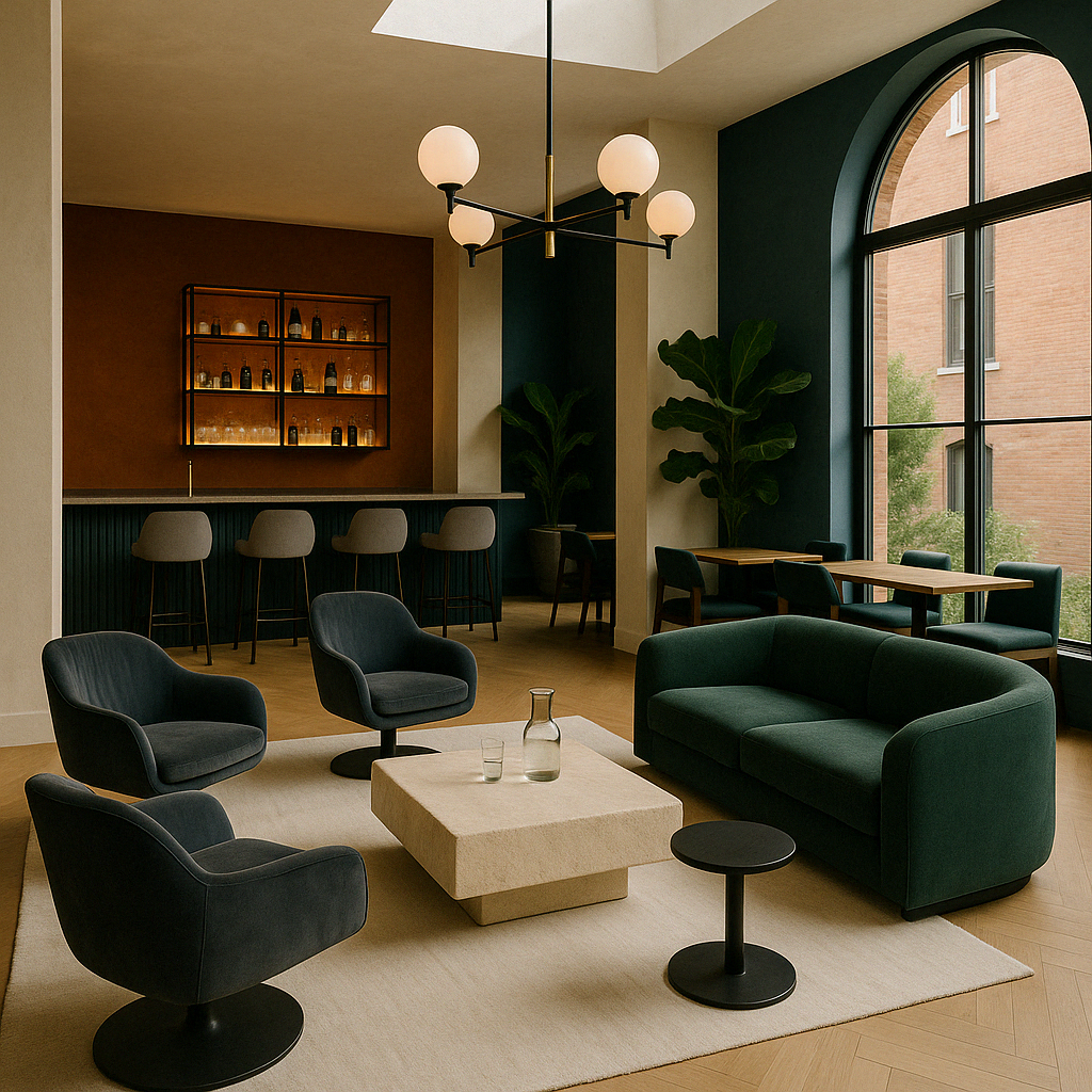 A lounge where shape and shadow play together, holding space for stories, silence, and everything between.