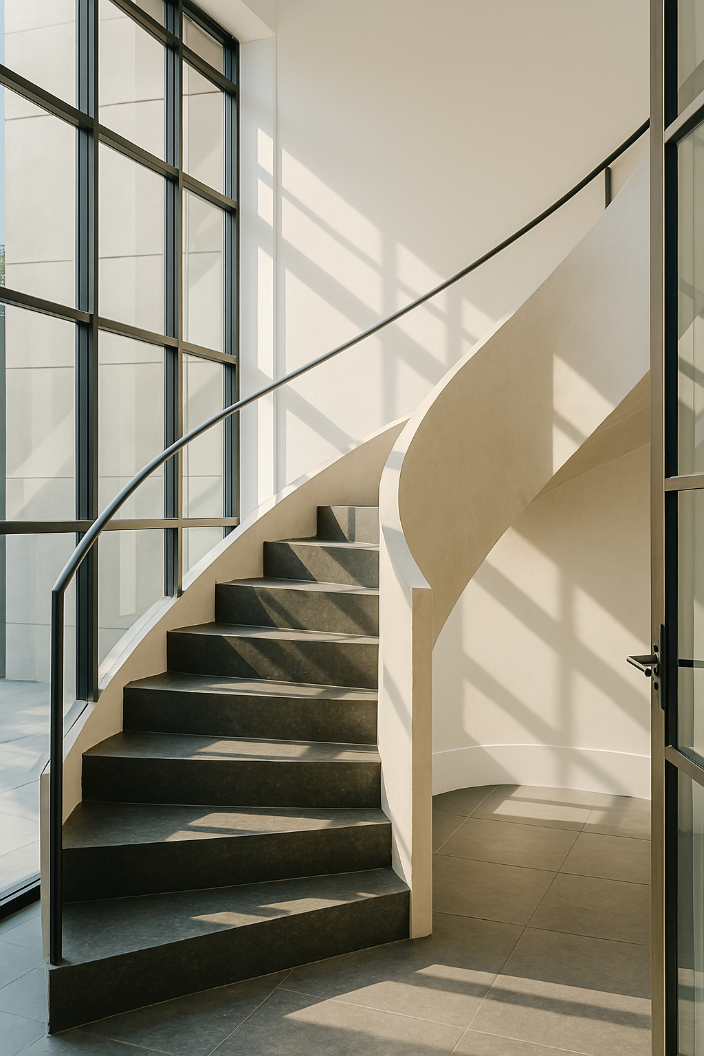 A sculptural staircase in Palo Alto that catches 4pm sun just right — designed for reflection, not just circulation.